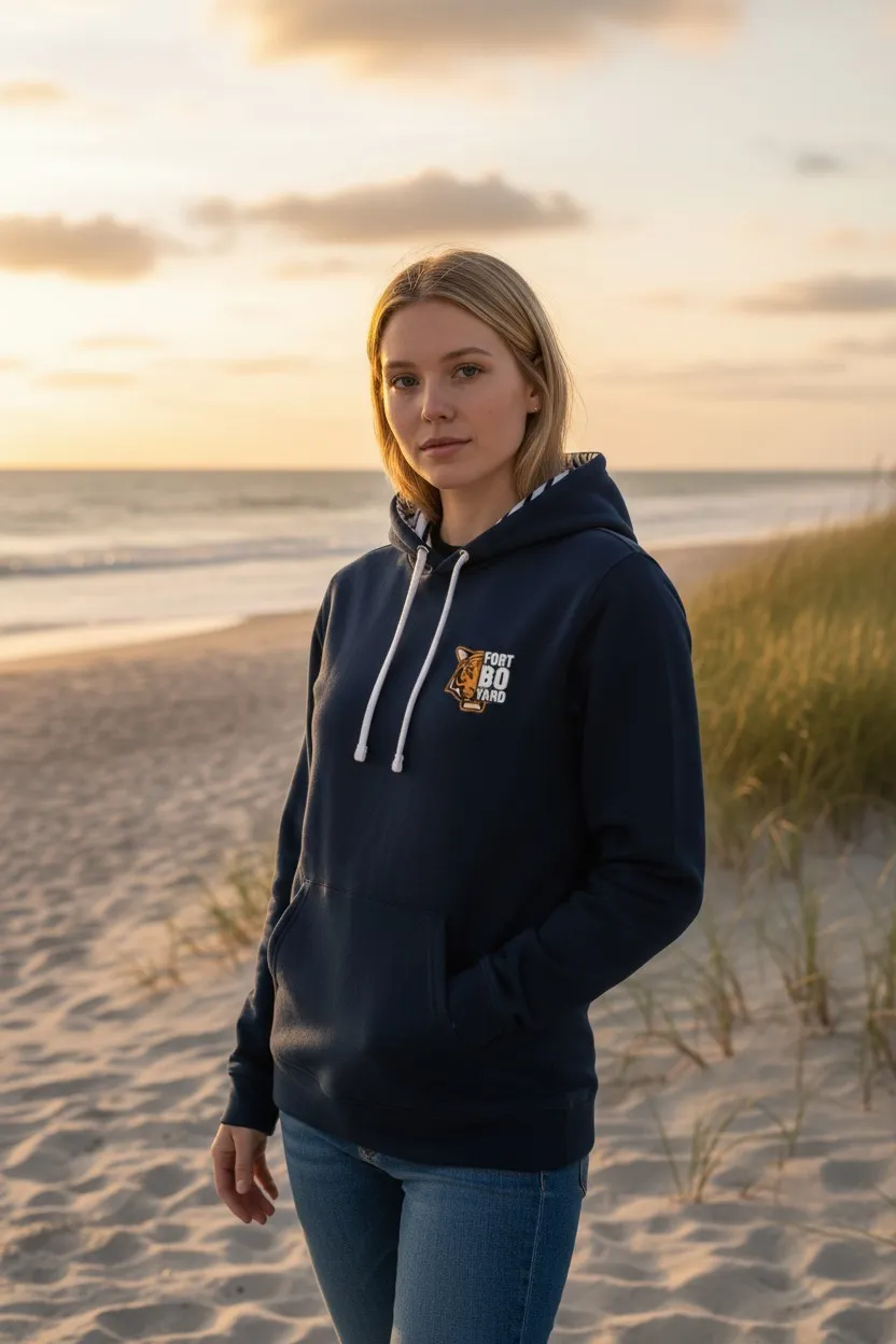 80% coton / 20% polyester. Coton peigné. Molleton gratté 3 fils. Coupe ajustée. Manches droites. Poches kangourou. Finitions bord-côte 1x1 aux poignets et bas du vêtement. Capuche doublée avec tissu à thème en coton jersey imprimé et cordon de serrage contrasté.