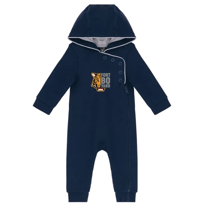 85% coton / 15% viscose pour tissu Oxford Grey, 100% coton pour tissu Navy. Molleton non gratté. Ouverture sur le devant avec zip et boutons pression. Intérieur de capuche contrasté. Bas de manches et de jambes en bord-côte.